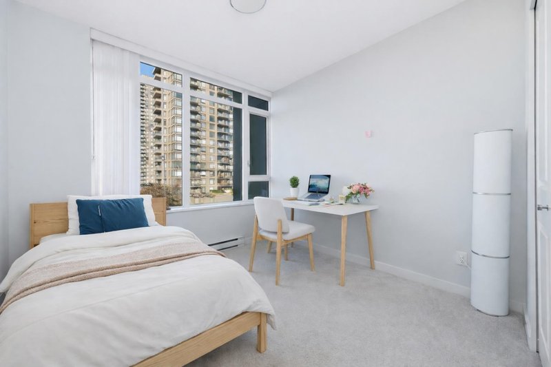 FULTON HOUSE by Polygon. This Southwest corner home offers 2 bedrooms and 2 bathrooms with a bright, open layout and a pleasant outlook. Approximately 800 sq. ft., the thoughtfully designed floor plan provides excellent privacy, with bedrooms positioned on opposite sides of the living area. The L-shaped kitchen features stainless steel appliances, a gas cooktop, and a generous island offering ample counter space. Soaring 9-foot ceilings and expansive windows allow for abundant natural light throughout. Residents enjoy access to the impressive 28,000 sq. ft. Fulton Club, complete with an outdoor pool, hot tub, sauna, and fully equipped fitness centre. Just steps to Gilmore SkyTrain and minutes to The Amazing Brentwood, shops, and restaurants. Includes 1 parking and 1 storage locker