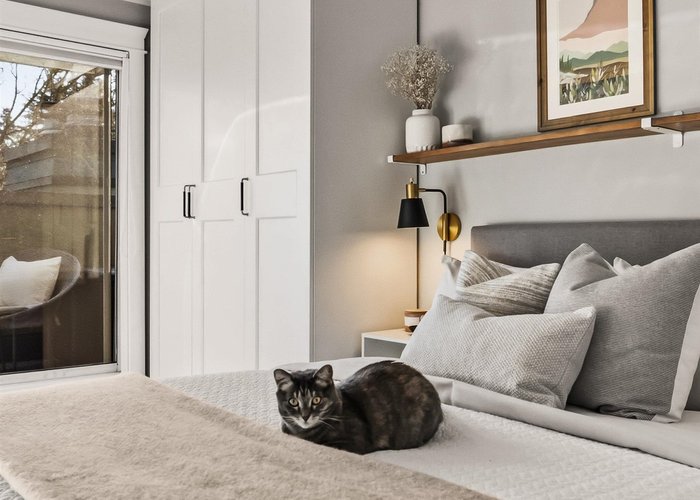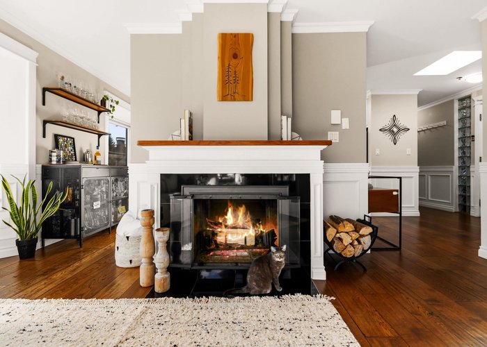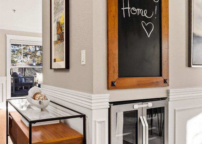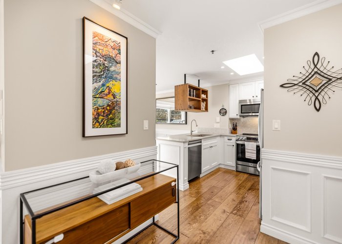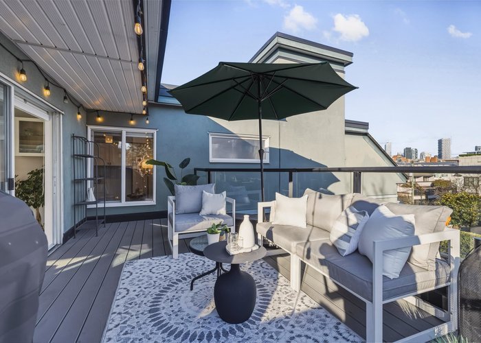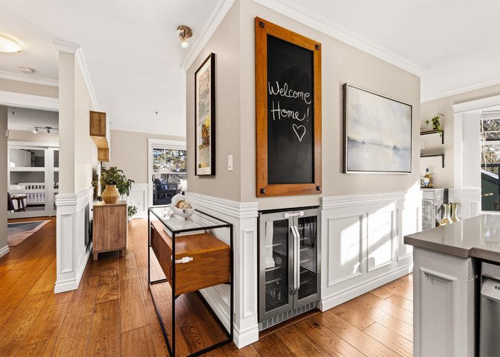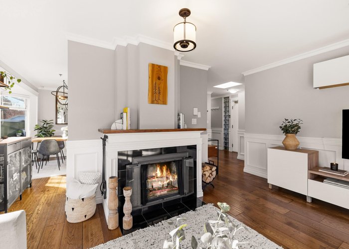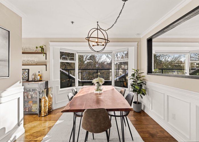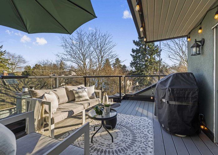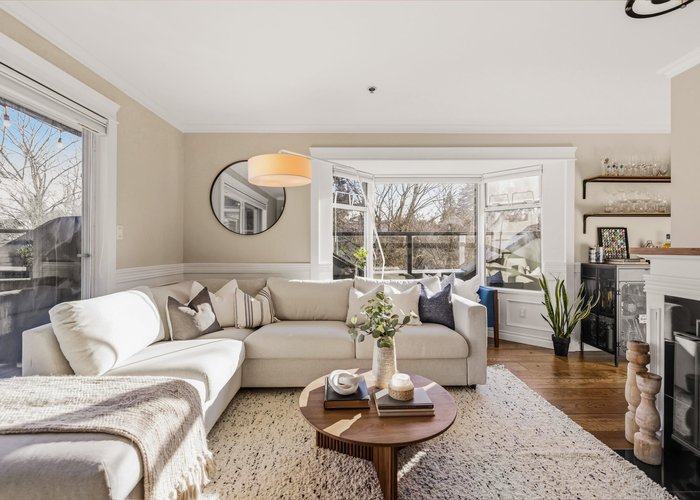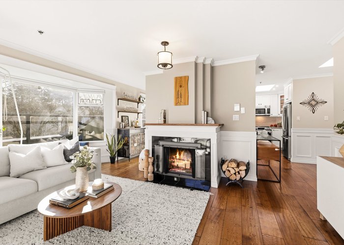 Welcome to this stunning penthouse in Kitsilano. This south facing 2bed+2bath 1,129 sqft home sprawls across the entire length of the top floor w NO shared walls. The expansive private patio extends your living space outdoor, ideal for quiet summer evenings. Bask in 3 sunny exposures & natural light from multiple skylights. Features include: spacious living room w cozy wood burning fireplace, engineered hardwood, charming wainscoting & crown moldings, custom built in’s, stainless steel appliances, wine fridge & granite countertops. Thoughtful layout w bedrooms on opposite sides of the home. The dreamy primary suite offers a spectacular ensuite w bay window, heated floors, glass rain shower & luxe free-standing bathtub. Rain-screened building w 2 parking w EV. Pets welcome. A TRUE GEM!