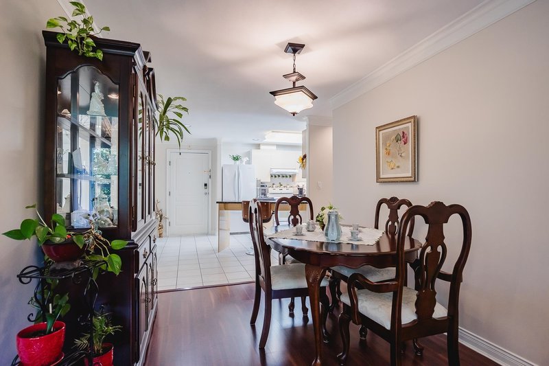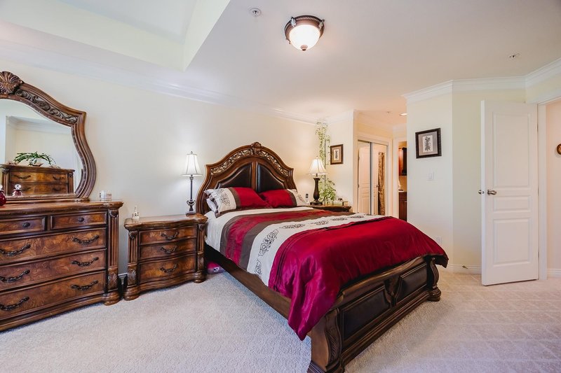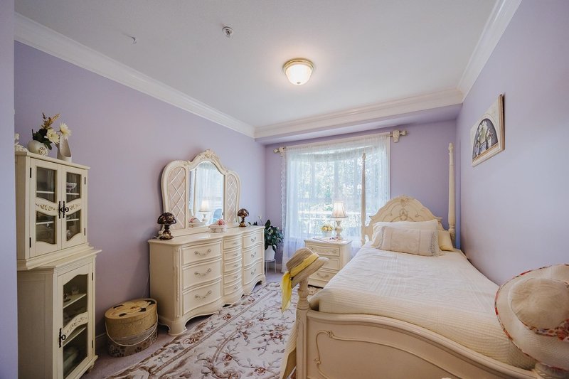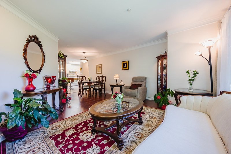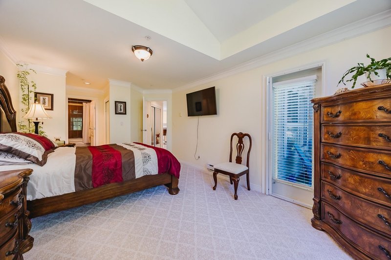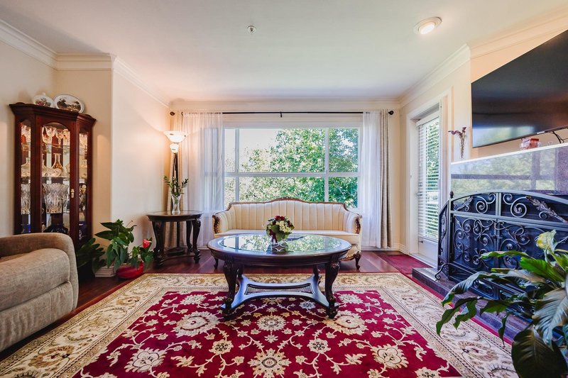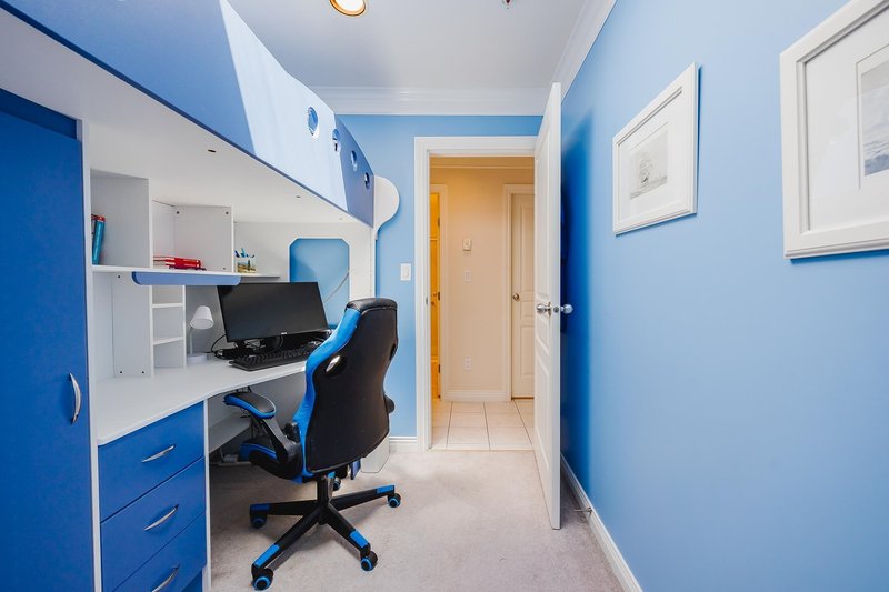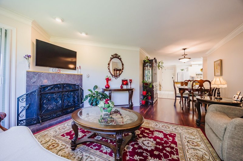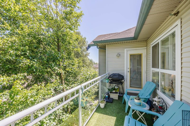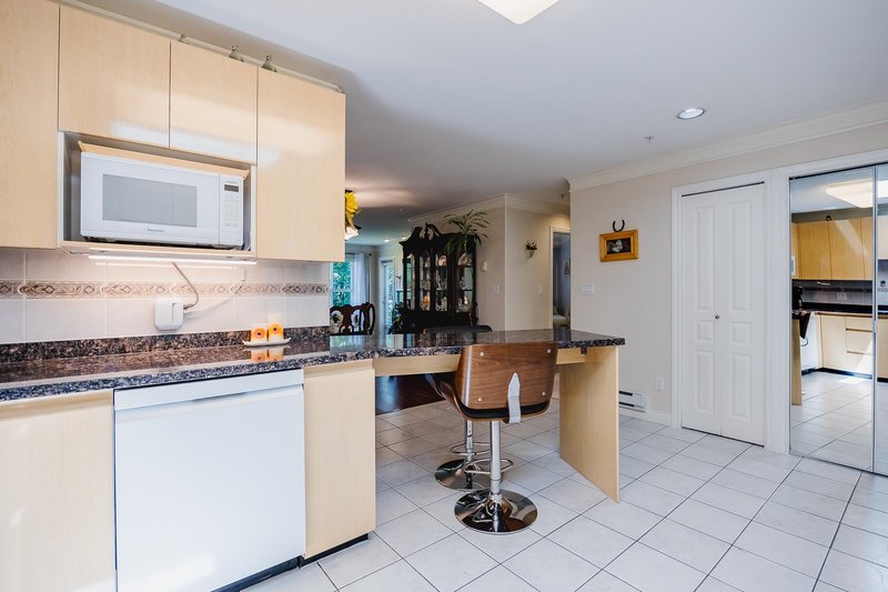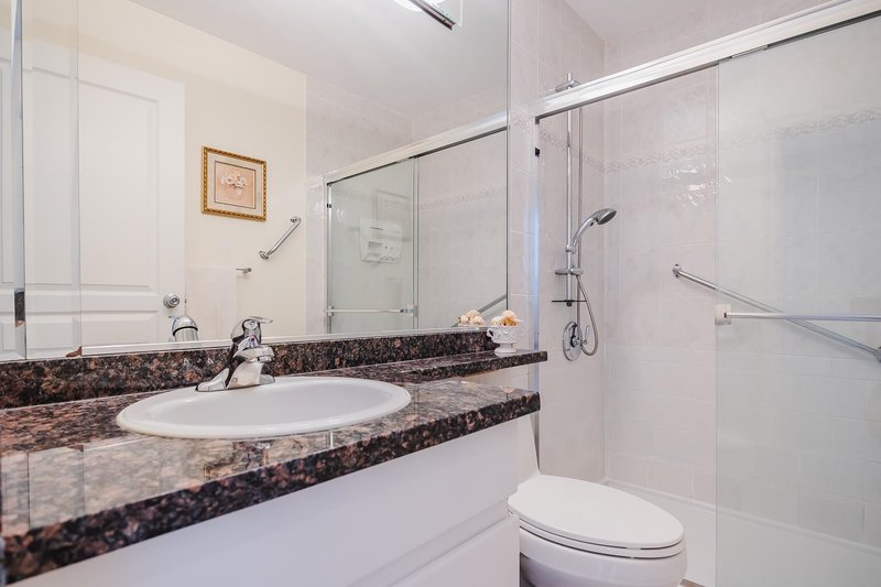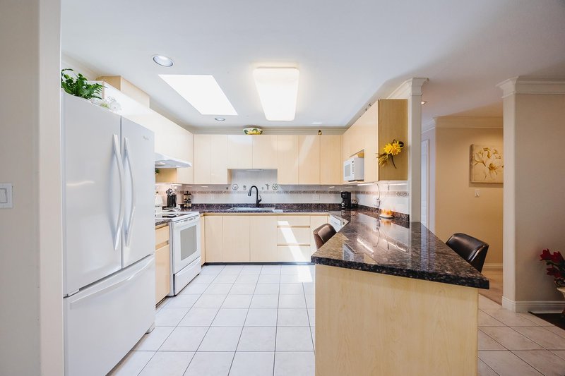 Rare opportunity to own the largest unit in the complex! This top-floor, 3 bed + den condo (den can be used as a 4th bedroom) offers an open-concept layout with a family-size kitchen featuring granite countertops, lots of counterspace and storage. The spacious living room has a cozy fireplace and opens to a private balcony—perfect for summer BBQs. Vaulted ceilings, 2 skylights, crown mouldings, granite bathroom counters, and balcony access from the primary bedroom add to the charm. Bonus: in-suite laundry room. Maintenance fee includes hot water, gas, sewer, water, and garbage. Close to Superstore, schools, transit, restaurants, banks, and easy access to Alex Fraser Bridge