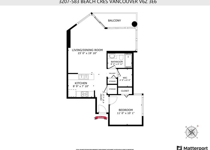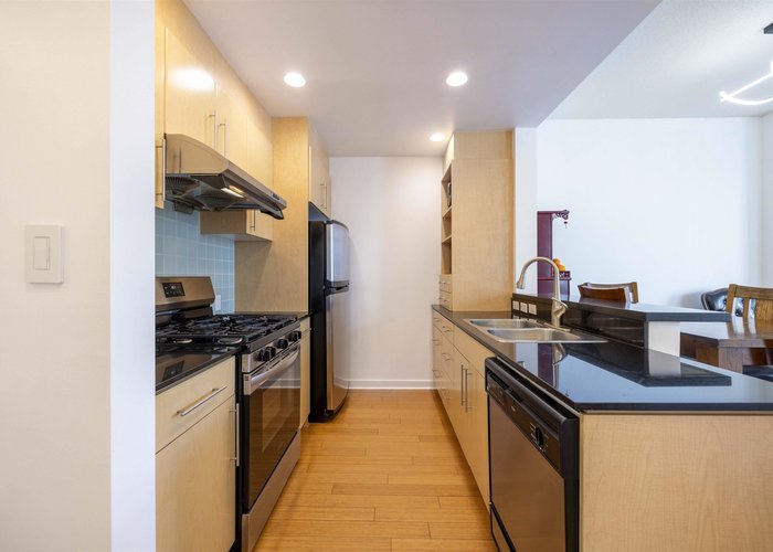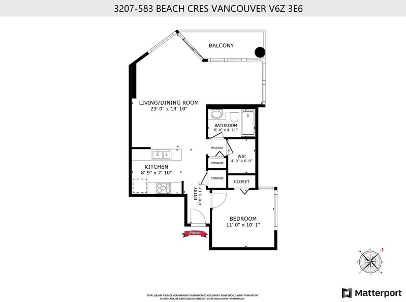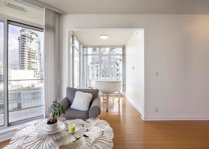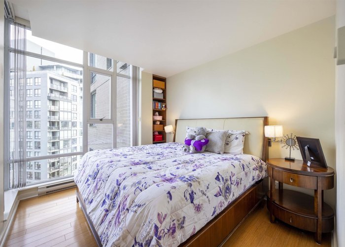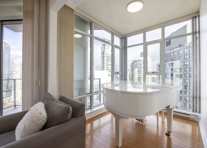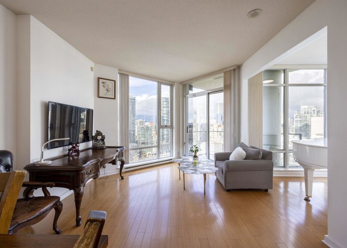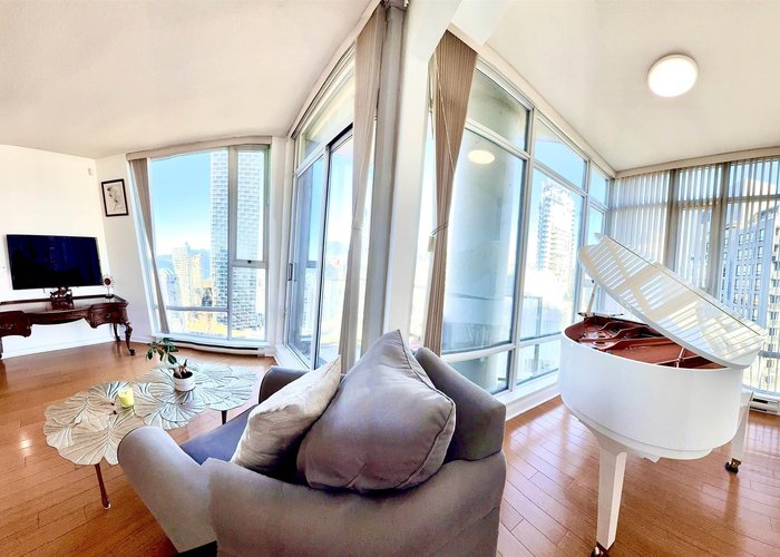 *****Very High Ceiling--9''6" ceiling (only 32nd floor)***** Welcome to Yaletown''s Beach Crescent - located near Waterfront, the living room and balcony offers stunning panoramic views of the city, the North Shore mountains, and the English Bay/Maina towards Vancouver Island. Directly outside this unit is the seawall and George Wainborn Park. This spacious one bedroom (king-size bed) has a large Den, which can be an office or second bedroom). There is a rain shower with body sprays, a custom walk-in closet, and solid Bamboo flooring. Amenities include a large indoor pool, hot tub, steam room, fitness centre, movie theatre, guest suites, and a 24-hour concierge.