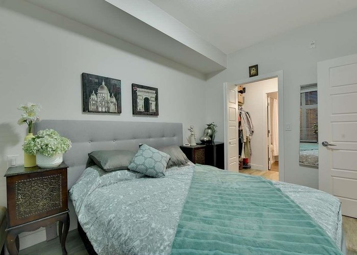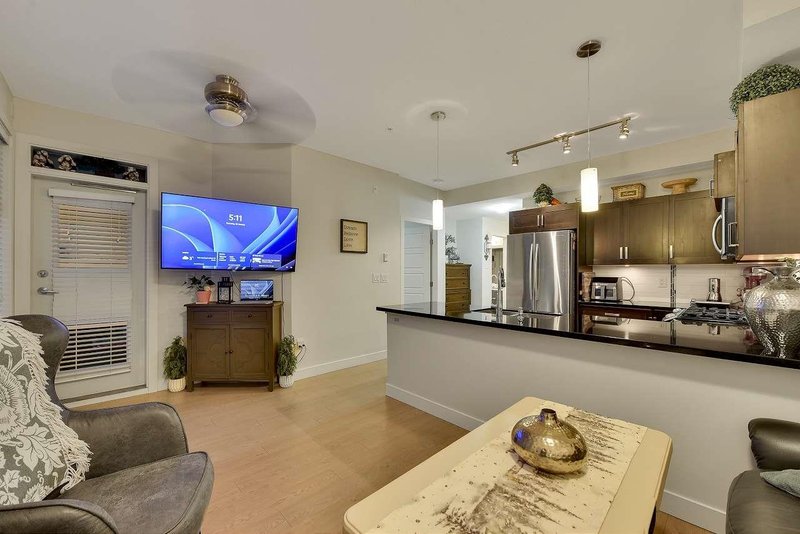 Discover stylish urban living at The Varsity, ideally located near the upcoming Skytrain extension. This 1-bedroom, 1-bathroom condo features an open concept with wide-plank laminate floors, a gourmet kitchen with stainless steel appliances and granite countertops, and a private deck with a gas BBQ hookup. The east-facing unit offers mountain views and ample natural light. Enjoy a spa-like bathroom, a bedroom with built-in organizers, and convenient amenities including a gated complex, covered parking, and visitor parking. Pets and rentals are allowed.