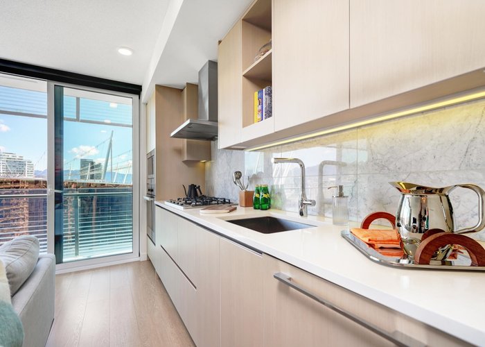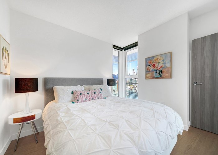 WOW! AT THE ARC, your own PARKING WITH LEVEL 2 CHARGER\ 4 LARGE LOCKERS. 24/7 concierge, co-working space, outdoor fire pit, BBQ, lounge, garden plots & kids'' area. Steps to Yaletown, Seawall & vibrant sports & entertainment district! Step out of the 20th-floor elevator to the luminous amenities of The Arc with glass-bottom pool, sauna, steam, hot tub, gym, heated lounge chairs, and sky lounge.The privacy of curved corridor leads to this luxury 2-bed + flex, 2-bath corner home where you will enjoy full-size Miele appliances, spa-inspired baths, wrap-around balcony, and stunning city, mountain & water views through triple-glazed floor-to-ceiling windows, double slider type patio doors. Best flowing plan with no lost corridor space, on the PREFERRED QUIET SIDE AWAY FROM CONSTRUCTION NOISE.