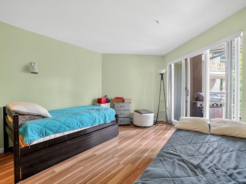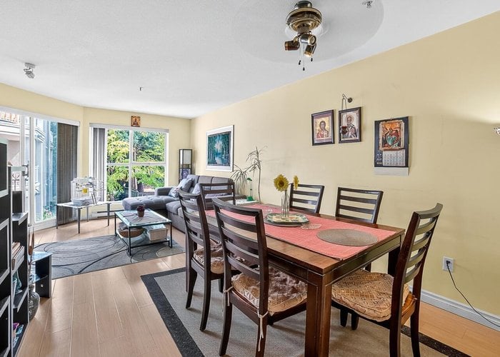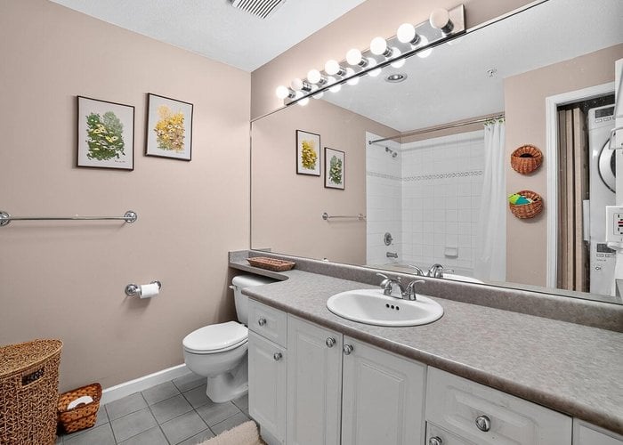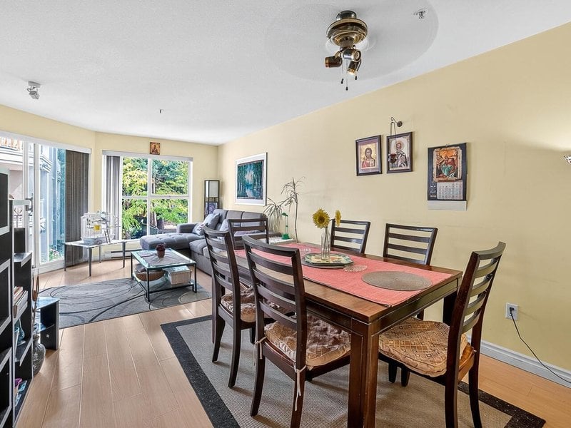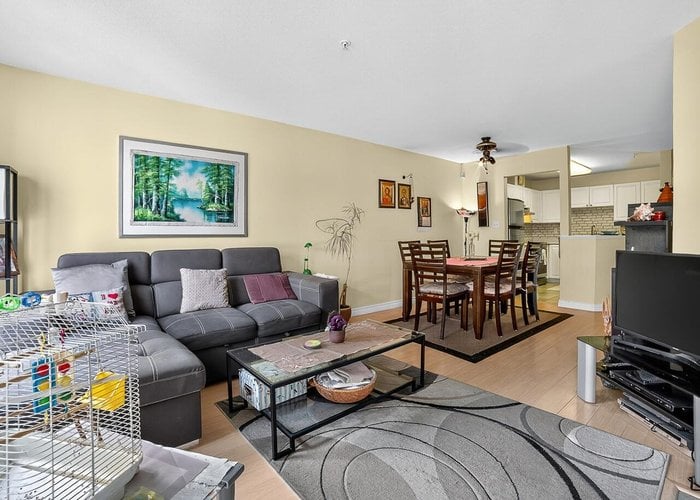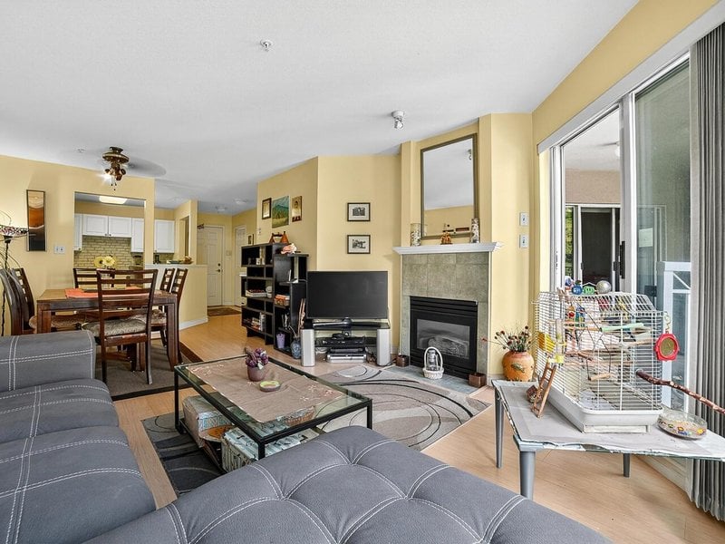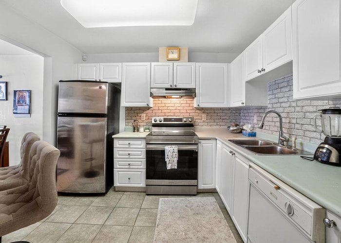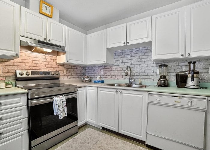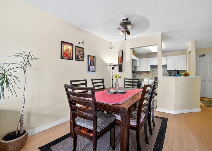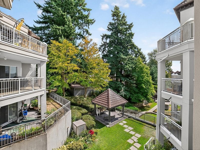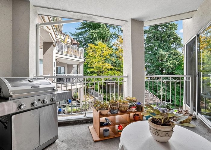Welcome to Kingsgate Court in uptown New West. This inside corner unit opens up to laminate wood floors in the foyer, running to the dining room and living room with a gas fireplace and sliding glass doors that step out to the covered balcony, accessed as well from both bedrooms. The open kitchen has a breakfast bar opposite the stainless steel appliances and double sink. In suite storage sits adjacent to the hall closet. The three-piece main bathroom sits across the hall from the second bedroom. The primary bedroom, enjoying the same green belt, courtyard views from the deck and living room, has double mirrored closets on the way to the en suite and stacked washer and dryer. 2 cats/dogs allowed.