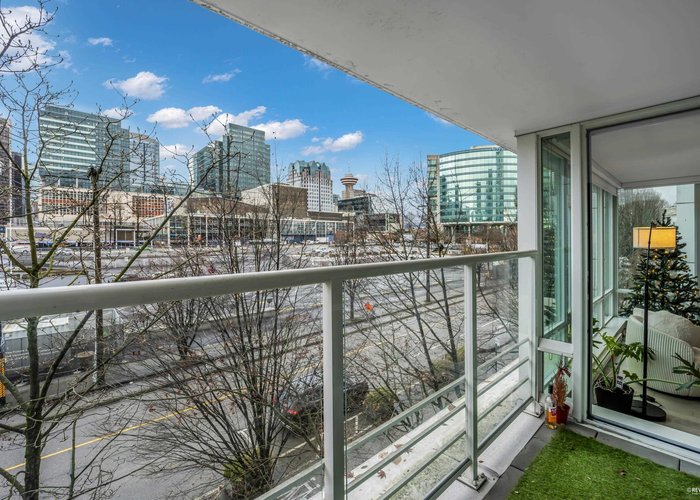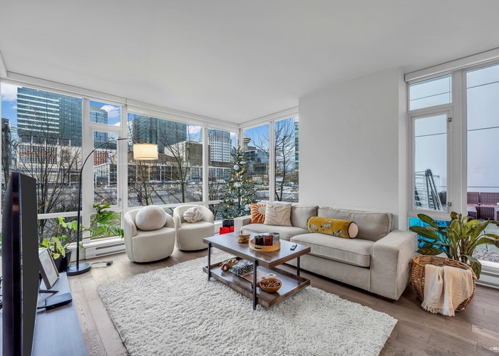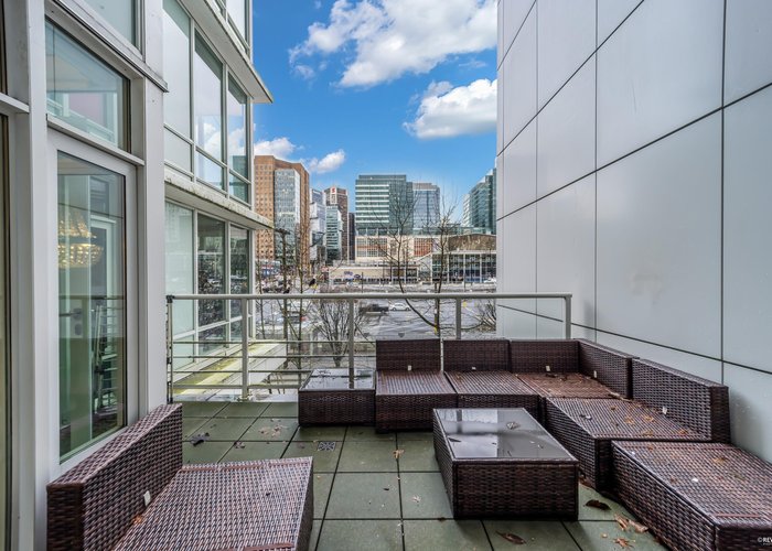 Welcome to COSMOS by Concord Pacific – a modern, smartly designed 2 bed, 2 bath + den + solarium in the heart of downtown Vancouver. This bright corner home features quartz counters, sleek cabinetry, in-suite laundry and floor-to-ceiling windows that flood the space with natural light. A rare highlight is nearly 200 sqft of patio connecting the primary bedroom and living room, plus a large balcony off the second bedroom for morning coffee or evening drinks. Enjoy resort-style amenities: 24/7 concierge, rooftop lounge with hot tub & BBQ, bowling alley, fitness centre, pool, sauna & steam. Unbeatable location steps to BC Place, Rogers Arena, Gastown, restaurants, shops & SkyTrain – perfect for urban professionals and investors alike.