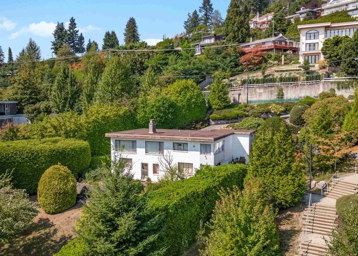 Prime Location! Amazing South-Easterly Views! This exceptional view lot features approximately 77 ft of frontage and a depth of 275/239 ft, totaling 17,061 sq. ft. The value is in the land, but there’s an excellent opportunity to update the existing home and rent out both levels. The upper main floor is approx. 1,200 sq. ft. with 2 bedrooms, 1 bathroom, and expansive views. Lower level - self contained -is approx 1,200 sq. ft. with 2 bedrooms, 1 bathroom, and a separate exterior entrance opening onto private, tranquil gardens. (The home requires updating, but the potential is there.) The property is bordered by protected green space - providing a lush, private setting .Hold, update, rent, or build new — the possibilities are endless.