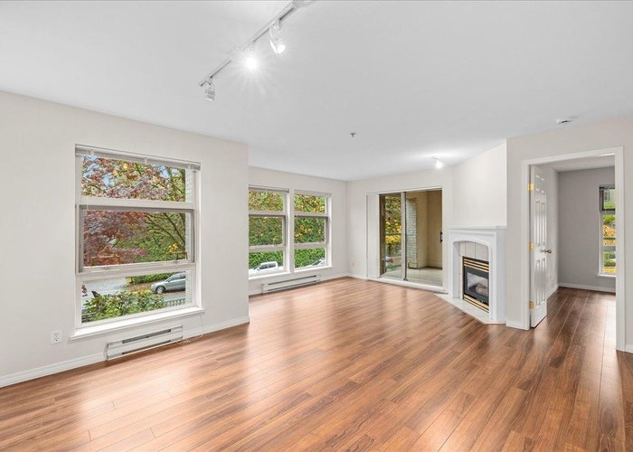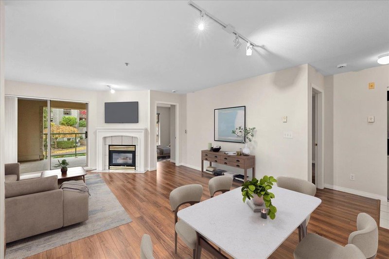2 bed 1 bath CORNER UNIT @ Heritage Grand. Soaked in NATURAL LIGHT w/ serene treed exposure facing the quiet courtyard side of the bldg. Completely private w/ no one looking in! Functional ~900 sqft unit features open living & dining areas w/ cozy gas fireplace that leads to your huge almost 200 sqft covered balcony - perfect for BBQs, entertaining or relaxing! Primary bdrm w/ walk-thru closets & cheater ensuite. BONUS: TWO parking spots, 1 locker. Amazing location WALKING DISTANCE to shopping & restaurants @ Newport & Suterbrook Village, Brewers Row, Rec Centre & Inlet Stn Skytrain. Short ride to the W/C Express @ Moody Station! Outdoor enthusiasts will love the proximity to the Inlet Trail, Rocky Point Park, Buntzen & Sasamat Lakes. Priced Below Assessment w/ Quick Possession possible!