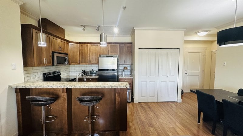 GREAT VALUE for this very well kept 2 bed, 2 bath unit on the top floor in sought after SOHO building, comes with 2 large side by side parking stalls as a bonus! This cool North facing, very quiet unit with 9'' high ceilings, freshly painted with crown moldings offering amazing views of the North Shore Mountains is a must see. Open concept with granite countertops, modern steel appliances, electric fireplace, maple kitchen, balcony for barbeques, large Master bedroom has a walk-in closet, 2nd bedroom & bath is far apart for privacy. Well run building with low strata fees includes water & sewer has great amenities like guest suite for out of town guests, party hall & a gym! Located in the heart of Surrey with shopping, transit & Kennedy Trail Elementary withing steps.