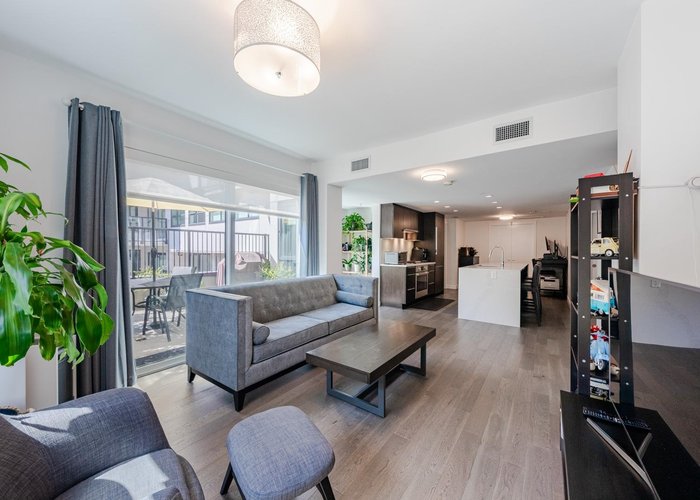 Welcome to The Leveson, nestled in the vibrant South Granville neighborhood. This QUIET (away from Granville) ground-floor, single-level 2 Bedroom + Office home boasts 460 sq ft of private outdoor space. With its elegant, contemporary A/C design and dual access from the street and building, it feels more like a townhome. The chef-inspired kitchen features premium Bosch appliances, a gas cooktop, and quartz countertops with a sleek waterfall edge. The spacious primary bedroom easily fits a king-sized bed, includes a large walk-in closet, and a luxurious double vanity ensuite. Two generous patios with gas hookup are ideal for BBQs and entertaining. Unbeatable location near transit, shops, dining, and top Vancouver schools. Includes 1 EV parking and upgraded locker attached to the stall.