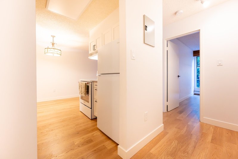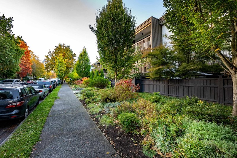 A thoughtfully renovated ground-floor home offering privacy, a unique private yard, and a superb Mount Pleasant location. This is an extra large one-bedroom and den or Junior 2 bedroom. It opens to a spacious, fully private backyard framed by 5m tall cedar trees, with a terraced garden and partially covered patio — a rare feature. Inside, extensive renovations with new oak hardwood flooring, new kitchen, and a redone bathroom. In-suite laundry (permitted) with GE all-in-one unit, gas fireplace. Heat and gas included in strata fees. One parking and one locker included. A well-maintained, community-oriented building with recent major maintenance and beautiful gardens. Steps to Main Street shops and amenities, future SkyTrain station, parks, cafés, etc. OPEN HOUSE: Saturday, Dec. 6th 3pm-4pm