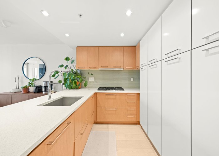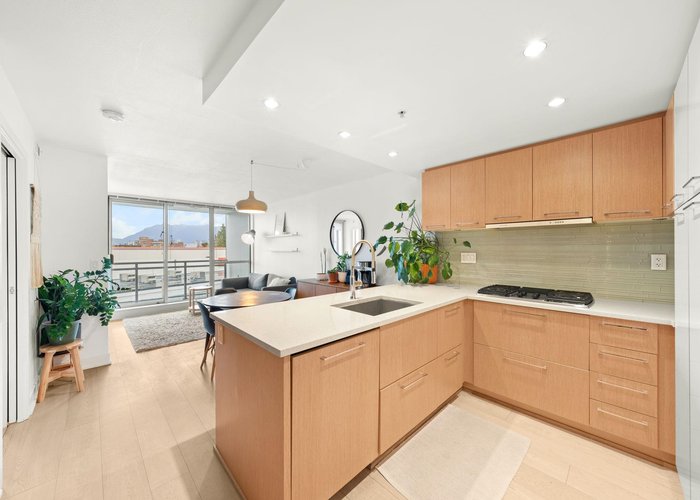 Welcome to Mantra, built by Cressey! This 673 sq ft. Sub-Penthouse 1 bed+1 bath boasts exceptional features, with a special highlight on its exquisite millwork and expansive kitchen cabinetry. The award-winning "Cressey Kitchen" is a standout, showcasing a gas cooktop, built-in microwave and oven, sleek quartz countertops, a wine cooler, and abundant cabinetry for unmatched storage and style. Custom millwork throughout elevates the home’s sophistication, adding elegance to every space. Enjoy floor-to-ceiling windows with breathtaking mountain and city views from the spacious living room, a functional den, a solarium, and a BBQ-ready patio. This concrete-constructed home also includes geothermal heating and cooling in the condo fees! Complete with 1 parking and 1 locker.