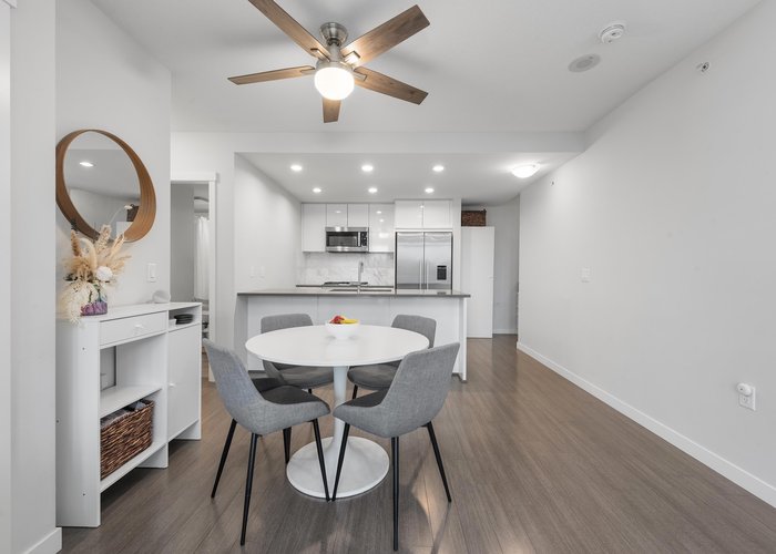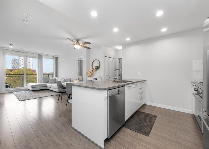 Welcome to Rhythm by Polygon, where modern design meets the calm of the Fraser River. This well-appointed 2 bed + den, 2 bath residence offers 929 sqft of airy, open living with a thoughtful split-bedroom layout for privacy. The kitchen blends style and function with polished quartz surfaces, stainless appliances, and generous cabinetry. A versatile den makes the perfect workspace or nursery. Step out onto your private balcony and take in serene views of the community and riverfront surroundings. Enjoy the Rhythm Club amenities—fitness studio, residents’ lounge, and courtyard retreat. Steps to River District Town Centre, cafés, parks, and trails. 1 parking, 1 locker. Easy access to Richmond, Burnaby, and New West.