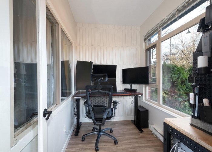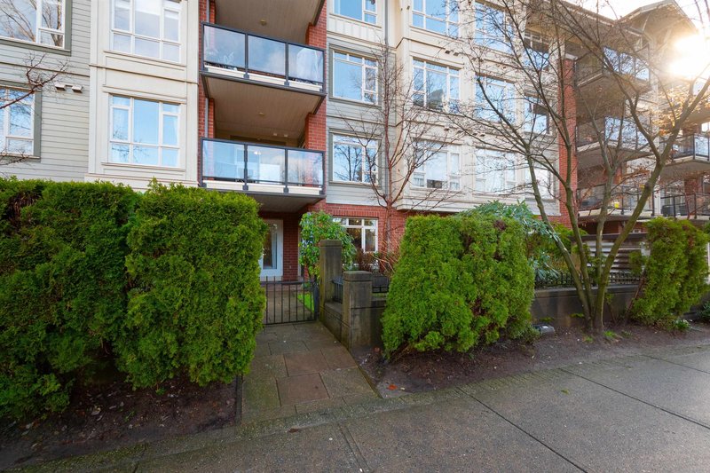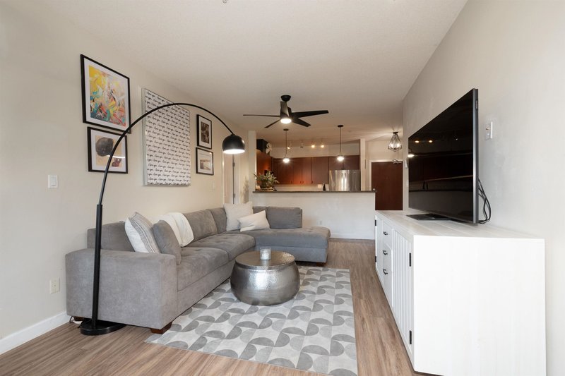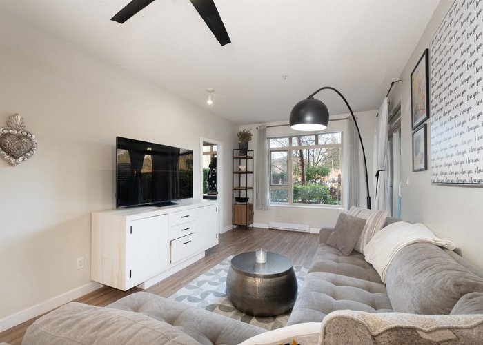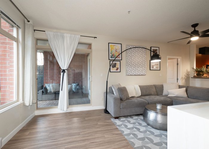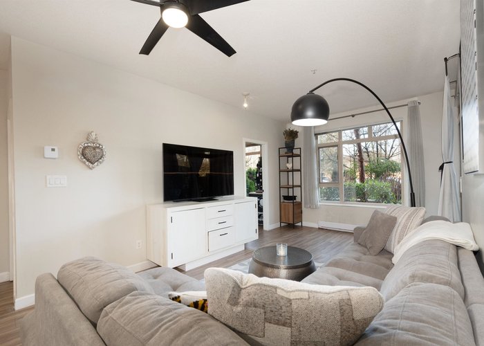 Beautifully maintained 2 bed, 2 bath + den ground-flr home in the highly sought-after Suter Brook community! Bright open layout, 9'' ceilings, & a spacious kitchen featuring stone countertops, ample cabinetry, & a breakfast bar that seamlessly connects to the dining and living areas. Step out to your private covered patio perfect for year-round enjoyment. The primary bedrm offers a walk-through closet and 4-piece ensuite, while the second bedrm is thoughtfully positioned for added privacy. The den is ideal for a home office or kids’ room. Complete with a 3-piece main bath, in-suite laundry, and a generous outdoor space. Amenities including 2 guest suites, a gym, a two-level party room with kitchen. Steps to Rocky Point Park, SkyTrain, West Coast Express, breweries, shops, restaurants, & rec