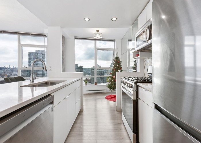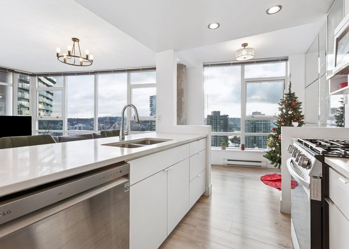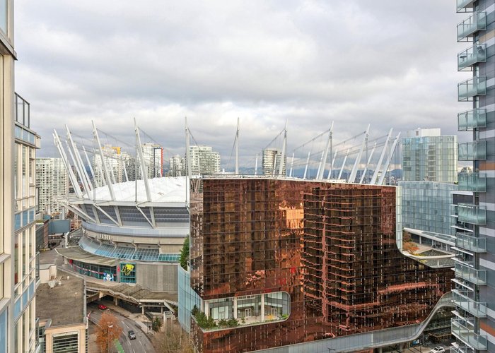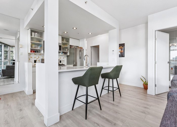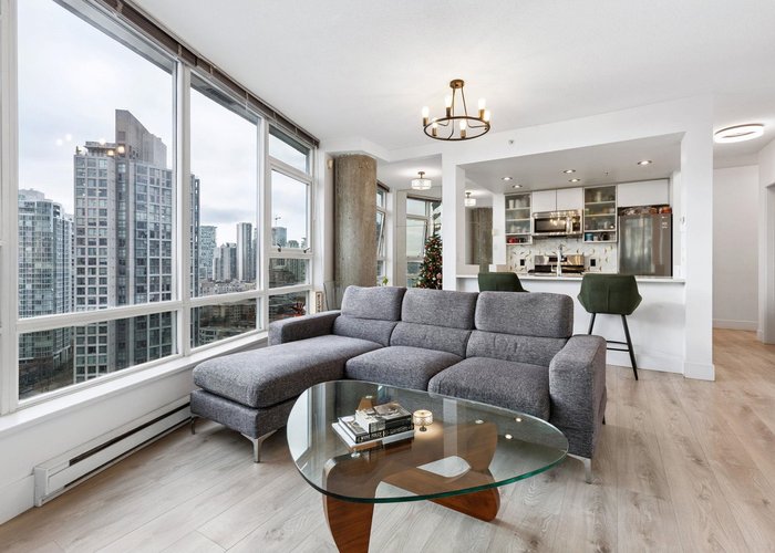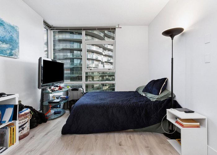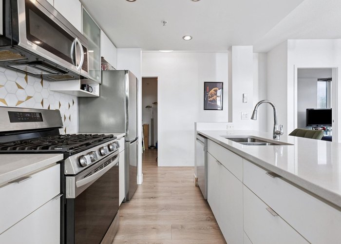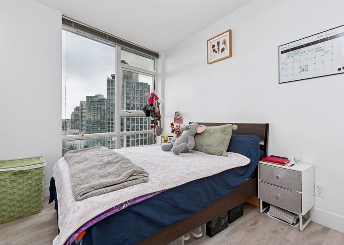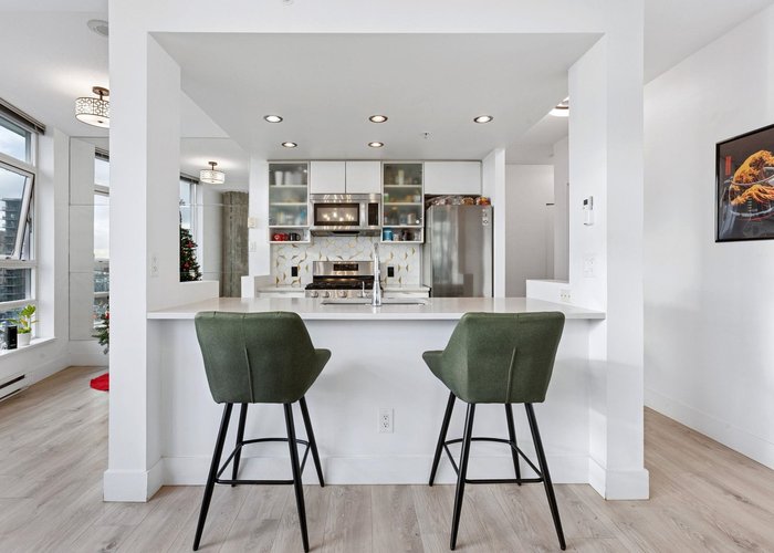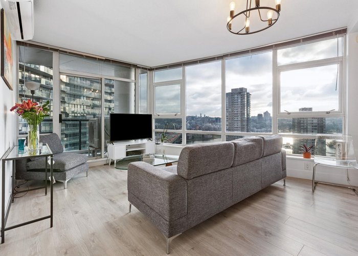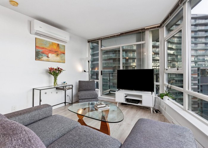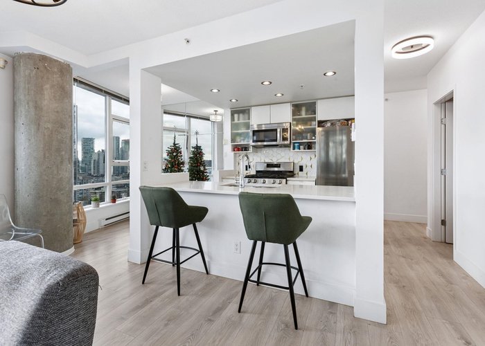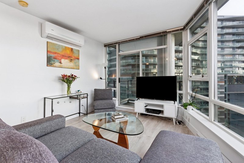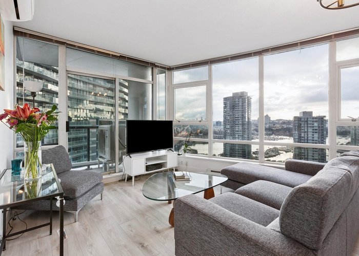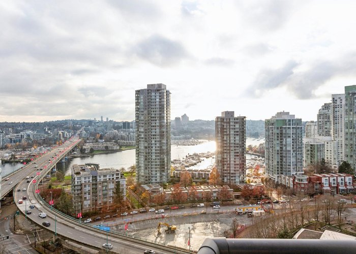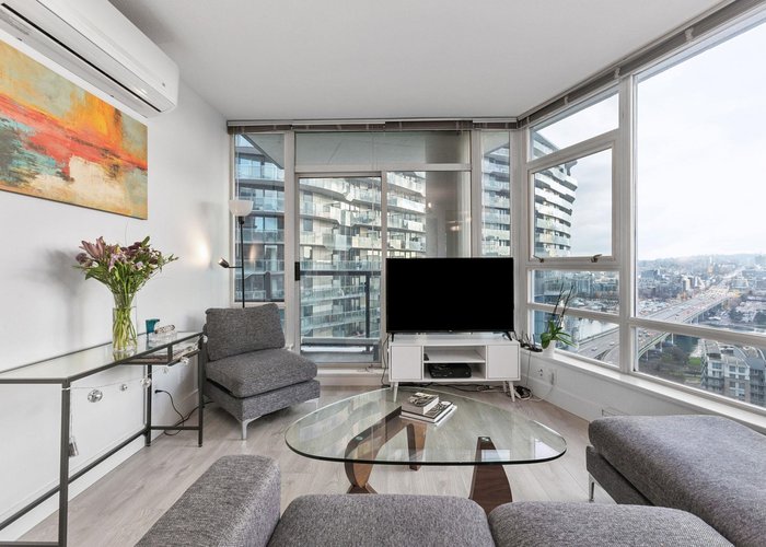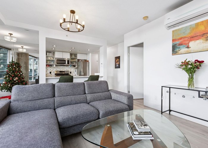 WELCOME TO THE MAX- Perched on the 26th level, this 2 bed + den corner suite has been thoughtfully updated, and welcomes you with streams of natural light + expansive views of False Creek from every room. This efficient floor plan has no wasted space: separated bedrooms for ultimate privacy, open concept kitchen/dining + breakfast bar, living and dining rooms w/floor to ceiling windows. Home features AC in living room, open concept kitchen with stainless steel appliances. Complete with 1 Parking & 1 Locker. Residents of the Max get exclusive access to Club Max: concierge, gym, indoor pool, sauna, hot tub, party room + more. 1 PARKING/ 1 LOCKER/ 3 ELEVATORS. Nestled next to the MARINASIDE SEAWALL, Small Victory, Urban Fare, 500+ restaurants. OH: Dec 13, 2-4pm. Showings by appointment.