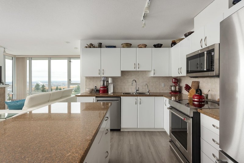 Come home to this 3 BEDROOM SUB-PENTHOUSE at Bosa’s GENERATIONS in New Westminster''s vibrant Uptown neighbourhood. This stunning corner unit home features an exceptional open concept layout with floor-to-ceiling windows that offer spectacular 230-degree VIEWS to the east, south and west. The large kitchen w/ central island, granite counters and Kitchen Aid appliances (incl induction range) flows seamlessly to both dining and living rooms complete with cosy gas f/p. With three good size bdrms, incl a generous primary w/ double closets and ensuite, it’s perfect for downsizers and families alike. Comes with 2 SIDE-BY-SIDE PARKING (near entrance) and separate storage. Perfectly situated just steps to nearby parks, shops, schools and restaurants.