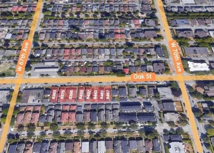 Developer Alert! Central Location 6 story development lots for Sale! 2 mins from Richmond, Vancouver Airport & 15 mins drive to Downtown Vancouver. Do not miss the chance to acquire 5 Lots Land Assembly 8423, 8433, 8437, 8439, 8443, 8461, 8463, 8467 Oak St.: Total Lot Size 18,946.27sf. It is under Marpole OCP and can be built for 6 Story apartment with 2.5 FSR (Buyer to confirm with the City).