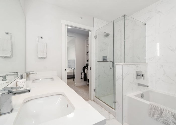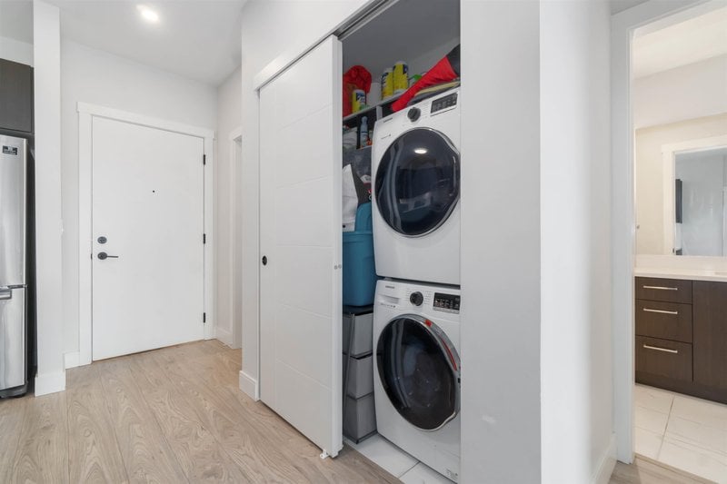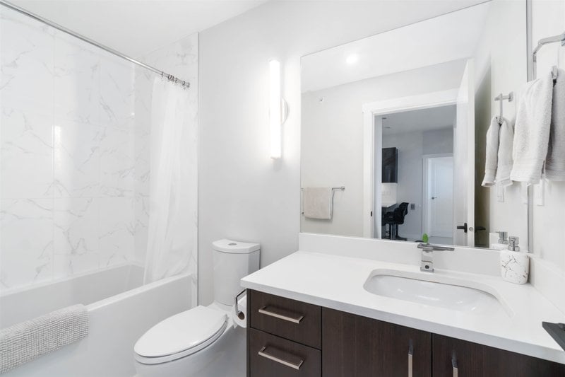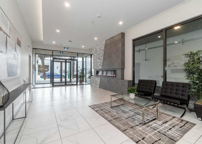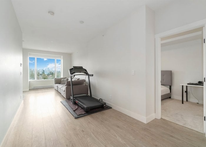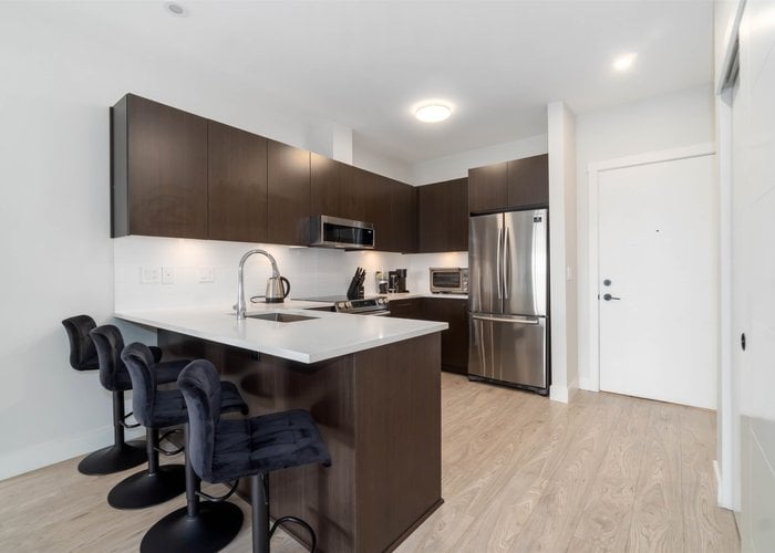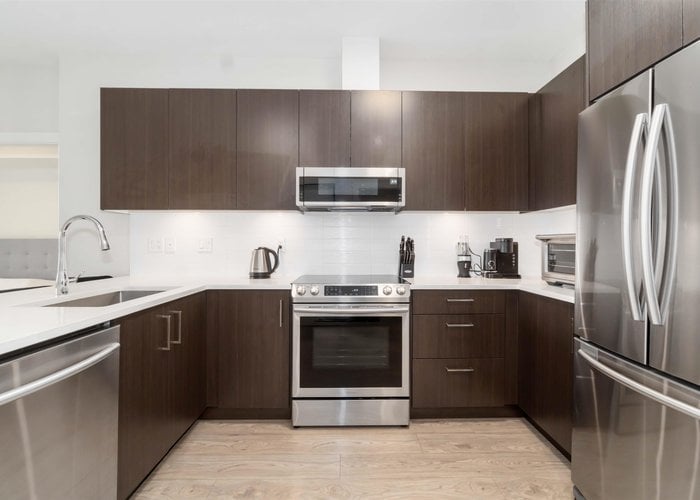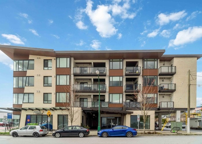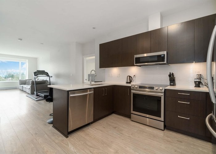 Tatlow Homes! Don''t miss this PENTHOUSE beautifully designed 2 bed + large den, 2 bath in Lion''s Gate Village area. This spacious home is appointed with laminate flooring, quartz counters, full-sized stainless appliances, and roller shades. Enjoy natural light streaming through large bay windows & step out onto one of TWO private balconies taking in views of Downtown Vancouver. The large primary bedroom features a walk-through closet & an en-suite with a tub, frameless glass shower, & dual-vanity countertop. This home even has a perfect office-sized den for a work from home setup. The building features guest parking, a gym, and a lobby lounge. Located near Park Royal, Ambleside Beach, & Lions Gate Village. 1 parking + 1 locker included!