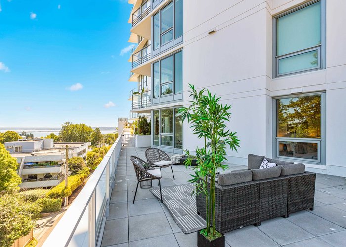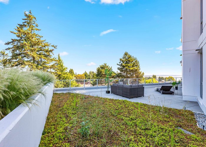 Welcome to Monaco This 2 bedroom plus Den unit has a extra large 535 sq ft deck as well as a 630sqft garden with some OCEAN an mountain views. Featuring Thermador appliances, floors of hardwood and heated tile in the large luxurious ensuite. 2 parking stalls with RI EV hookup and 2 storage lockers. The Building feature a gym, meeting/activity room and concierge.