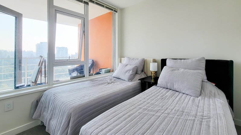 Million $ totally unobstructed view at all windows to Fraser River/Mountains/Vancouver Golf Course. Quiet East facing (no noise from Skytrain) one bedroom home sweet home with open balcony, one parking P3-155 & one storage locker P4-407-221, gym, theatre, party room and guest suite, opposite to Lougheed Town Centre & steps to Lougheed Skytrain Station with 3 Skytrain Lines to Downtown, New Westminster & Coquitlam Centre, stainless steel appliances, engineering laminate hardwood floor, gym, theatre, club house & party room. Open house 11:00-1:00PM Sept. 7 (Sun), offer by 4:00PM on Sept 9 (Tue).