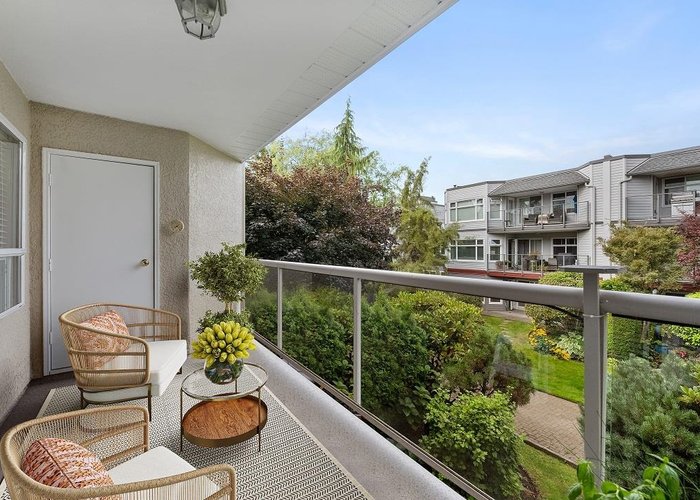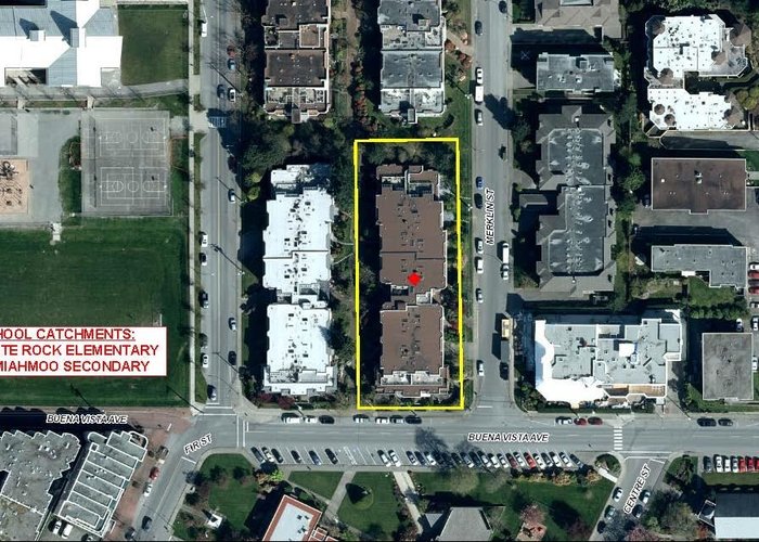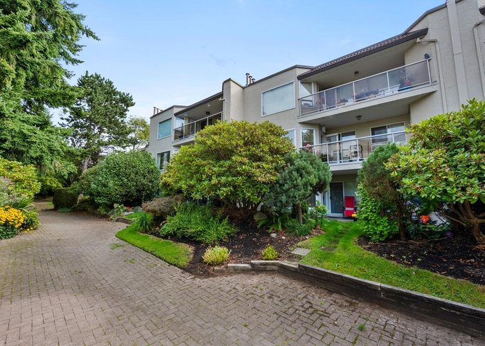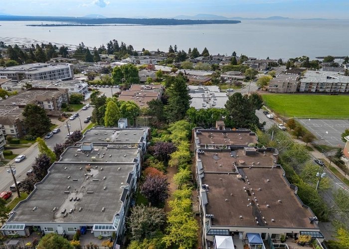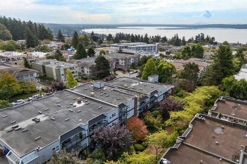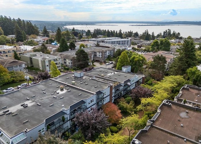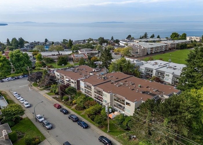 Englesea Manor II, such a nice convenient location for enjoying White Rock. walk score 94: sidewalk safe and well lit, close to transit, 1 block to White Rock Elementary, groceries, errands, parks, dining & entertainment. A rare, peaceful no traffic street. #407 is inside courtyard & facing west. 2 bedroom & 2 full bath, spacious 956 SF. Fresh air, open west facing balcony 92 SF and shed 26 SF on balcony. Secondary school catchment: Semiahmoo with IB program. Strata Fee: $577.05/Month, includes gas fireplace. Secure parking stall #17 / storage locker#14. Full strata package available. Virtual staging implemented on some photos, painted walls white & contemp furniture switched in - lots of possibilities here. Well priced to sell quickly.Rentals allowed & no pet restrictions.