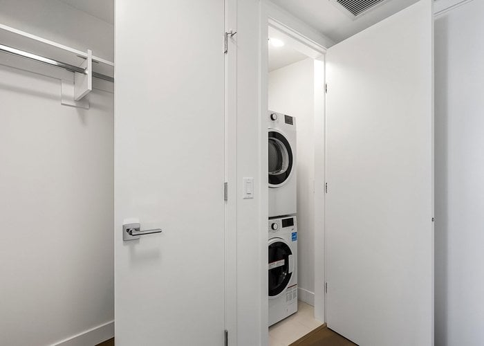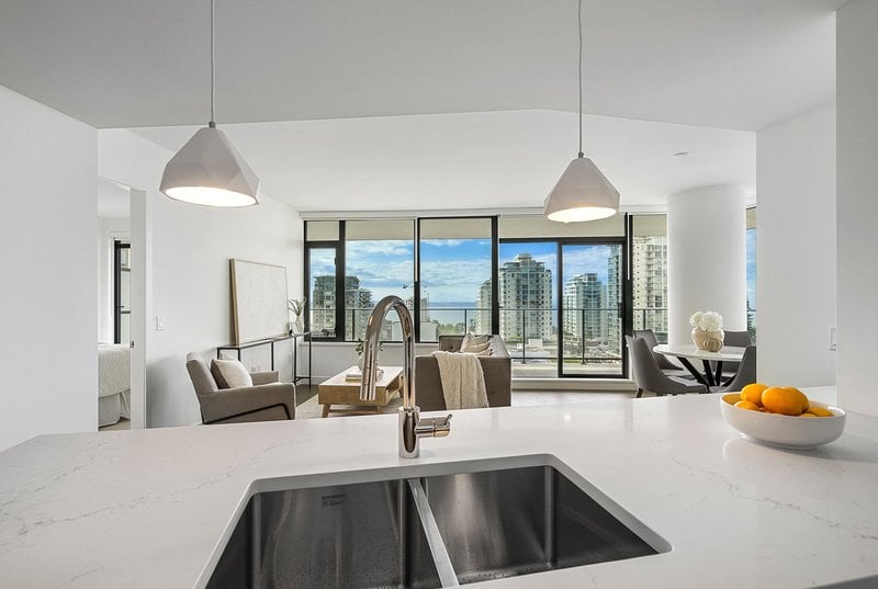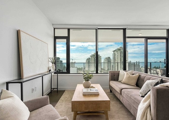 Brand new home exudes elegance and sophistication in the bustling heart of White Rock. This south- west corner 975 sf, 2 bdrm + den, 2 bath residence, with expansive 433 sf wrap-around balcony, boasts breathtaking 11th floor panoramic ocean and Gulf Island views. It showcases bright, open layouts, over-height ceilings, elegant finishes, air-conditioning and custom roller blinds. The modern kitchen features sleek, soft-close cabinetry, panelled Bosch stainless steel appliance package and a polished quartz, waterfall edge island, complemented by a contemporary color scheme and warm under-cabinet lighting. King-sized master bedroom has ensuite with quartz countertops, dual sinks and Grohe plumbing fixtures. Includes gas hook-up for BBQ, an EV-ready parking stall and storage locker.