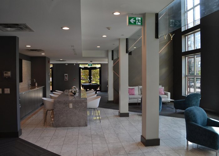 Trafalgar Square by Polygon, within walking distance of hundreds of shops, services and restaurants. 2 bedrooms and 2 full baths with a large private patio garden and outdoor water tap. Air conditioning. Over nine feet ceilings in main living spaces. Updates include new laminate flooring and wallpaper in bedrooms. Next door to the exclusive 5400 square ft. of amenities at the Trafalgar Club including a grand lounge, fitness studio/weight room, table tennis, billiards, music practice studio with piano, outdoor patio and children''s play area... 2 PARKING SPOTS total (one parking with a 110V outlet) and 1 locker included!
