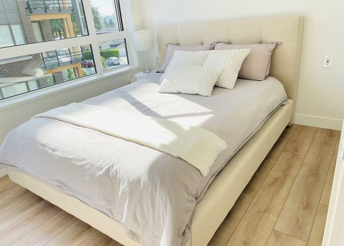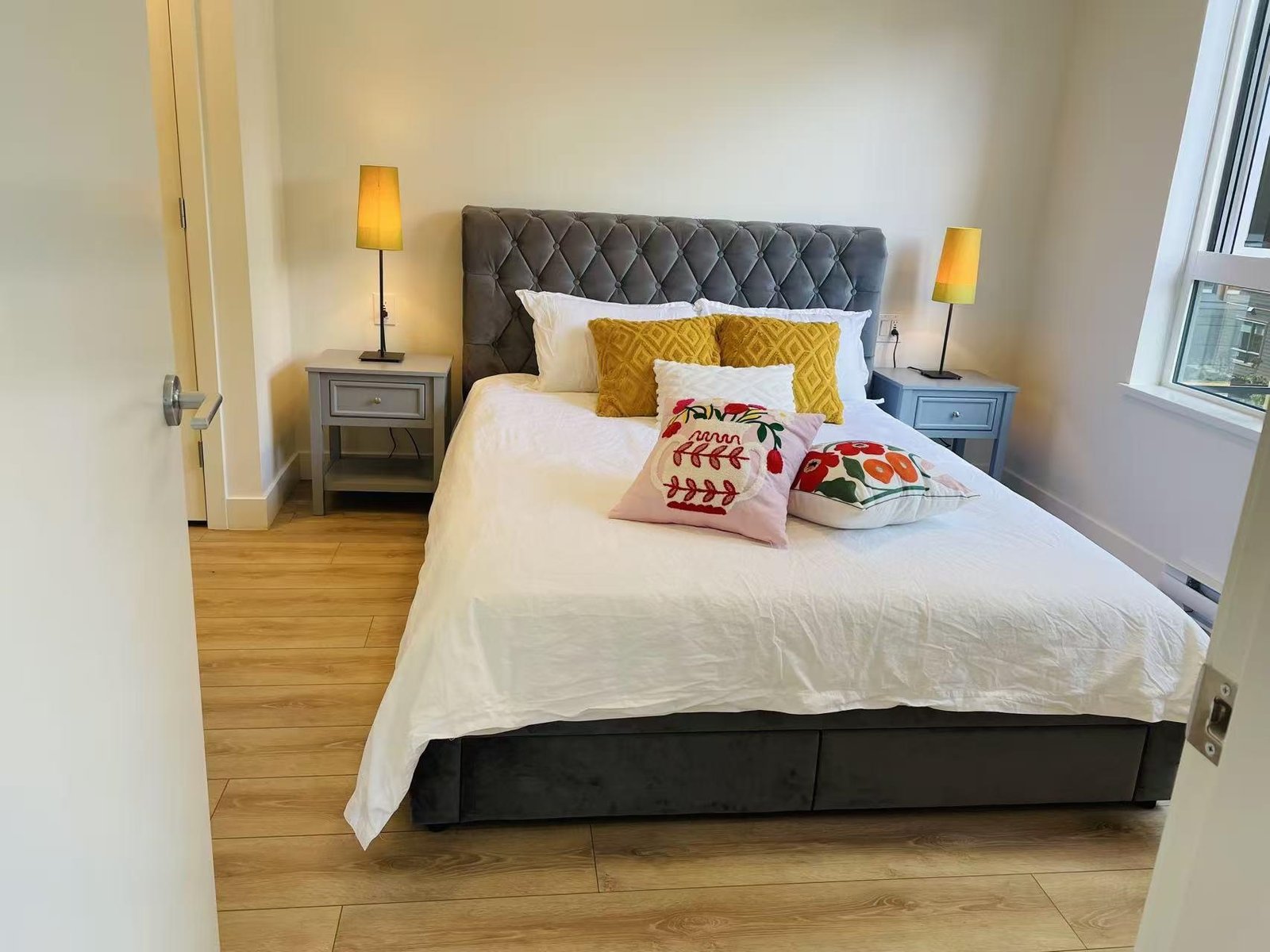 Welcome to The Oaks by Strand! This south-facing 2 bed+2 bath suite facing the quiet courtyard features a rare functional layout. Upgraded laminate floors. Amenities include: game room, party room, movie theater, co-working space, gym, and more. Conveniently located with easy access to SkyTrain, shopping mall, schools, parks, restaurants, groceries store, and SFU. Tenanted Property. Please allow at least 48hrs notice for showings.