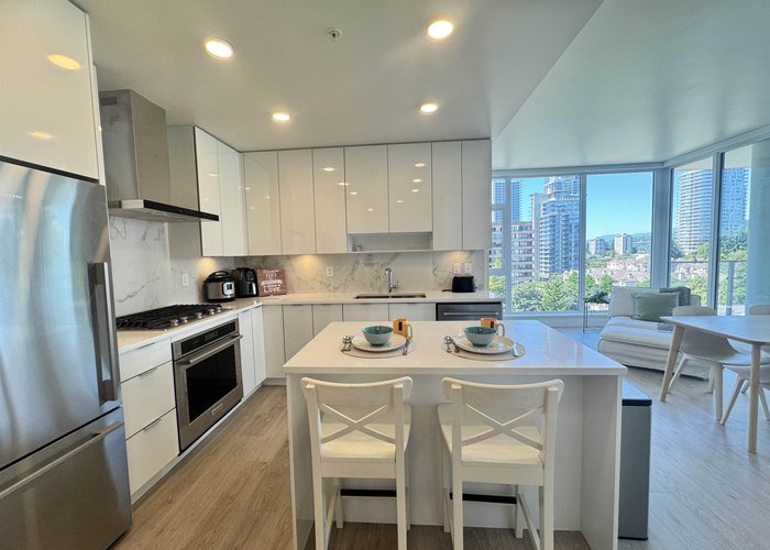ONE OF THE LOWEST PRICED CONCRETE HIGHRISE Corner Unit by Ledingham McAllister in SYDNEY features an open-concept kitchen and living area with 9ft ceilings, floor-to-ceiling windows, and a balcony with a 270° panoramic view of the city and amenities open area. The unit offers two elegant bathrooms, a stainless appliance package with gas cooktop and front-loading W/D (2-5-10 Warranty), plus a wheelchair-accessible floor plan with generous halls and doorways. Enjoy amenities like a fitness centre, yoga room, fireside lounge, meeting room, games room, guest suites, and a landscaped terrace with cabanas. Located in a quiet neighbourhood, just blocks from SkyTrain and Lougheed Mall. ASSUME MORTGAGE @ 2.64% TILL JAN 2028. OPENHOUSE SAT 2:00-4 PM