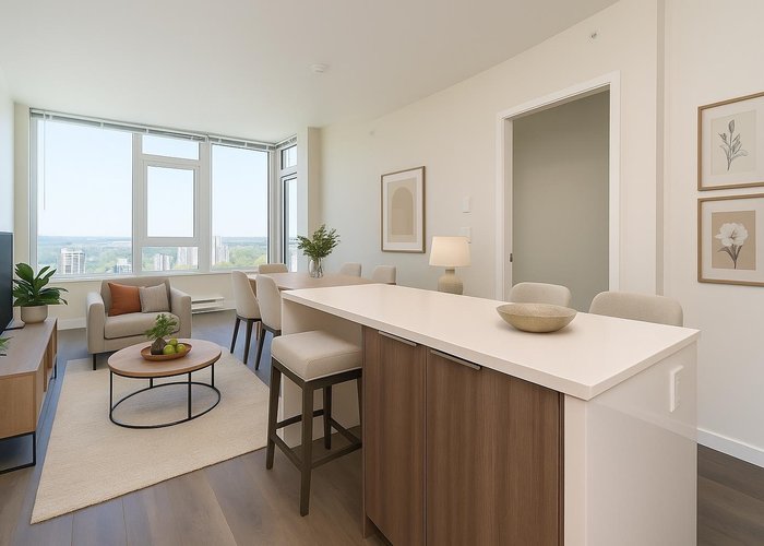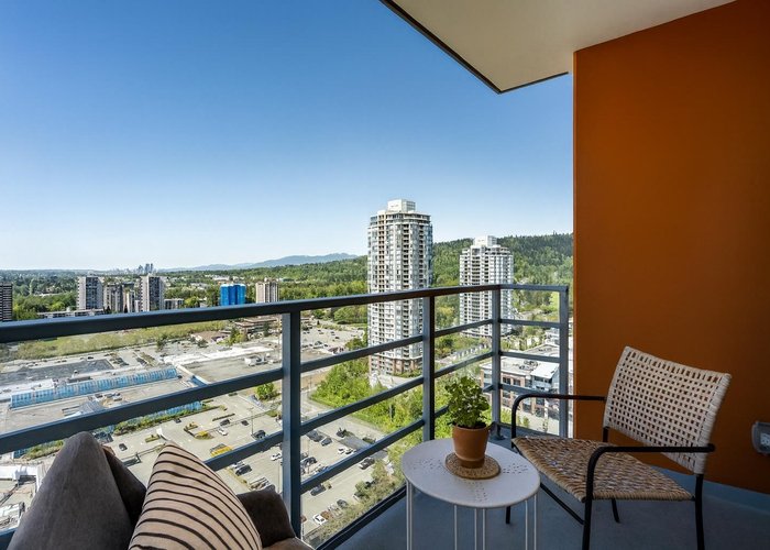 Welcome to Brookmere by Onni! This high-floor 1 bedroom + den home offers breathtaking city and mountain views through expansive floor-to-ceiling windows. Featuring a bright and functional layout with 9 ft ceilings, sleek laminate flooring, and a gourmet kitchen with quartz countertops, stainless steel appliances, gas cooktop, built-in oven, and a large island—perfect for cooking and entertaining. The versatile flex space is ideal for a home office or extra storage. Residents enjoy over 14,000 sqft of resort-style amenities, including a fully equipped gym, yoga studio, theatre, games room, lounge, BBQ area, playground, and concierge service. Just steps to SkyTrain, Lougheed Mall, restaurants, and more. Includes 1 parking and 1 storage. An excellent choice for first-time buyers or investor!