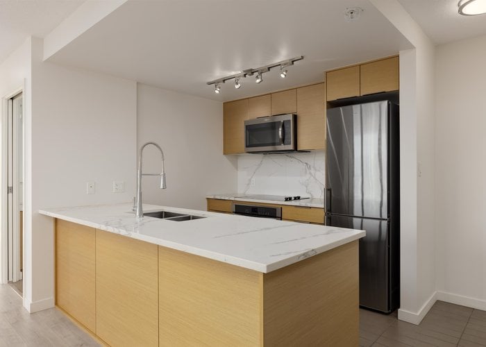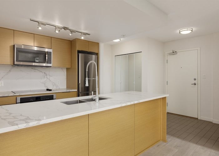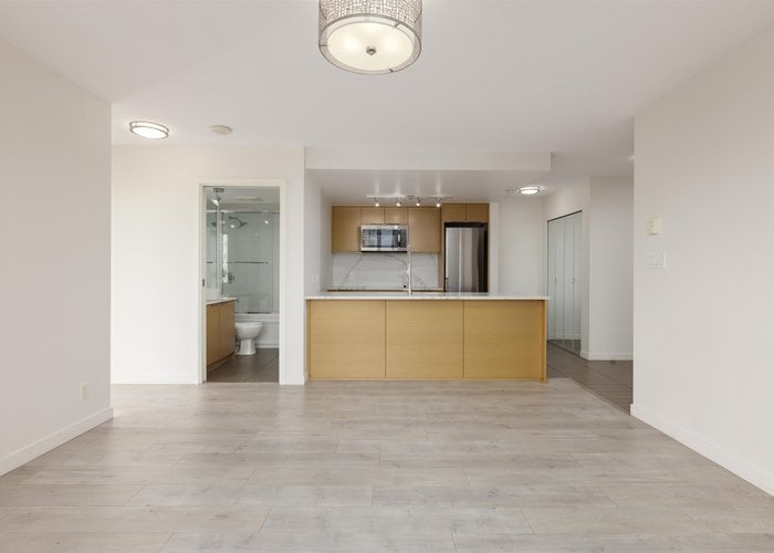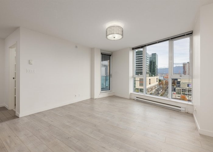 Exceptional high floor corner unit. Spacious residence with outstanding floor plan. Sweeping cityscape outlook with mountain background. Renovated floor, counters, with lux kitchen and bathroom. Expansive covered balcony for your bistro table and chairs. Best centrally located home...walking distance to shopping, restaurants, banks, library, sport facilities and more. Canada Line minutes away. Just move in...kick back...relax and enjoy.