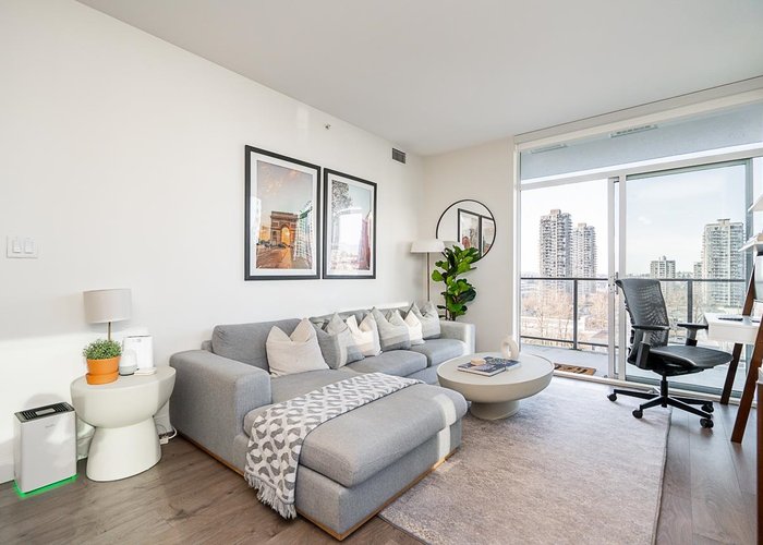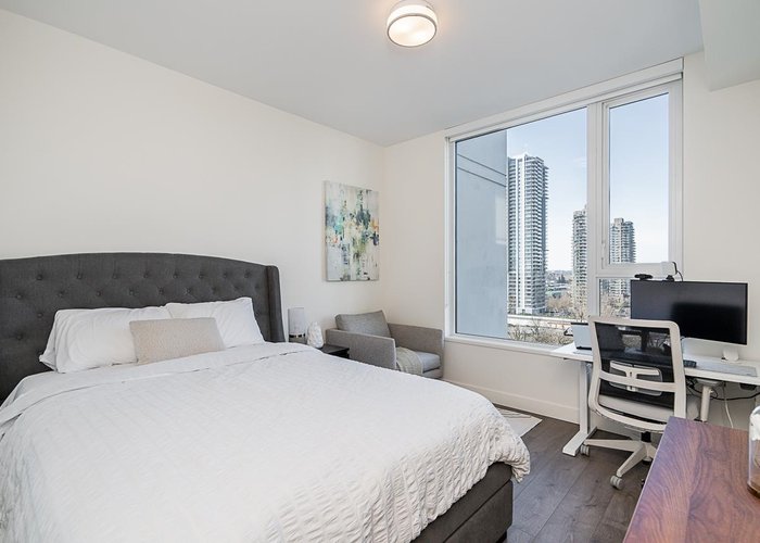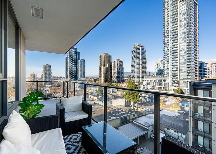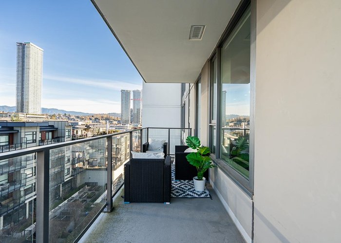 OPEN HOUSE SAT NOV 29th 2:00-4:00 Unit 707 is designed for a life that works. This LARGE corner unit is private, bright, and functional. The open-concept layout features 9-foot ceilings, air conditioning, and floor-to-ceiling windows that maximize light and space. The kitchen is equipped with full-sized, high-quality appliances, a gas range, and stunning waterfall countertops perfect for both everyday living and entertaining. The primary suite hosts a walk-in and ensuite with a glass soaker shower. Outside, enjoy sunsets and mountain views from the wrap-around terrace. Located steps from Brentwood Mall, transit, and parks, this home puts everything you need within reach. With thoughtful design and a prime location, this property is ready to help you live. Strata incl: HW, Heat, AC and Gas